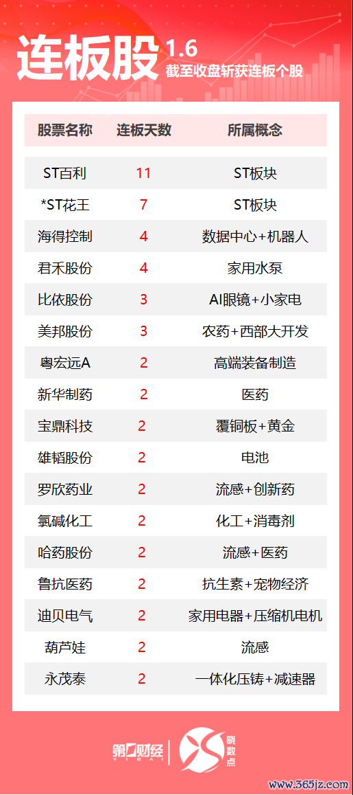 1月6日,数据显示,A股市场共计68只个股涨停。其中ST百利收获11连板,机器人概念股海得控制4连板,医药板块新华制药、罗欣药业、哈药股份等多股2连板。一图速览今日连板股>>